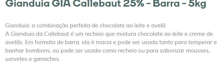 INGREDIENTES: Açúcar, avelãs, manteiga de cacau, leite em pó gordo, pasta de cacau, emulsionante, lecitina de soja, não contém glúten. Chocolate Belga Gianduia da Callebaut é um delicioso chocolate com 25% de avelãs que irá levar seus preparos para outro nível, esse toque perfeito fará toda a diferença em suas receitas. Ideal para a produção de doces finos e gourmets como ovos de páscoa, bombons, trufas, bolos, ganaches, sobremesas, coberturas, blindagens e muito mais.
