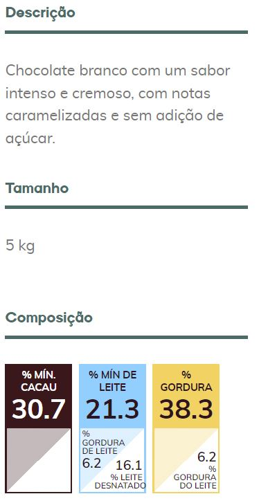 INGREDIENTES: manteiga de cacau, leite em pó integral, edulcorante: maltitol (trigo), emulsificante: lecitina (soja), aroma natural de baunilha. CONTÉM GLÚTEN. Alérgicos: Contém derivados de soja e derivados de trigo. Pode conter leite, contém lactose. Chocolate Belga Malchoc branco da Callebaut é um delicioso chocolate branco com teor de cacau em 30,6% e sem adição de açúcares que irá levar seus preparos, principalmente com restrições, para outro nível, esse chocolate fará toda a diferença em suas receitas. Ideal para a produção de doces finos e gourmets como ovos de páscoa, brigadeiros, bombons, trufas, bolos, ganaches, sobremesas, coberturas, blindagens e muito mais.