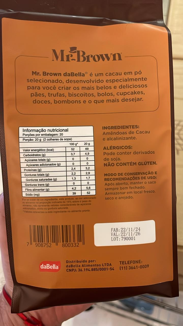 * DESCRIÇÃO: Mr. Brown é um cacau em pó selecionado, desenvolvido especialmente pela daBella Alimentos para você criar os mais belos e deliciosos pães, trufas, biscoitos, bolos, cupcakes, doces, bombons e o que mais desejar.