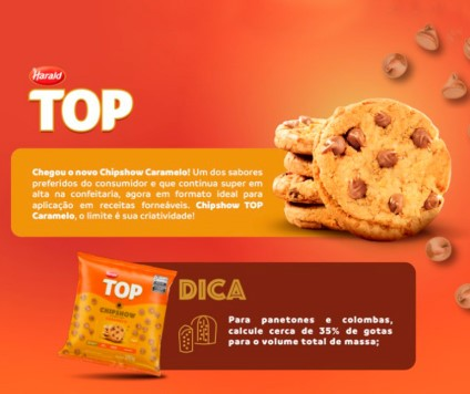 * DESCRIÇÃO: O Chipshow TOP Caramelo é um produto forneável, especialmente indicado para preparos como cookies, muffins, cupcakes e panetones. A resistência ao calor torna-o perfeito para misturas que precisam manter a integridade das gotas sem derretimento completo, mantendo a textura e sabor nas receitas. Importante lembrar que o produto não é indicado para derretimento, pois seu formato é projetado para assados que necessitam de pedaços de caramelo visíveis e firmes. Para receitas de panetones e colombas, recomenda-se usar aproximadamente 35% de Chipshow TOP Caramelo em relação ao volume total da massa. Essa proporção proporciona uma distribuição equilibrada, garantindo o toque de caramelo em cada pedaço.