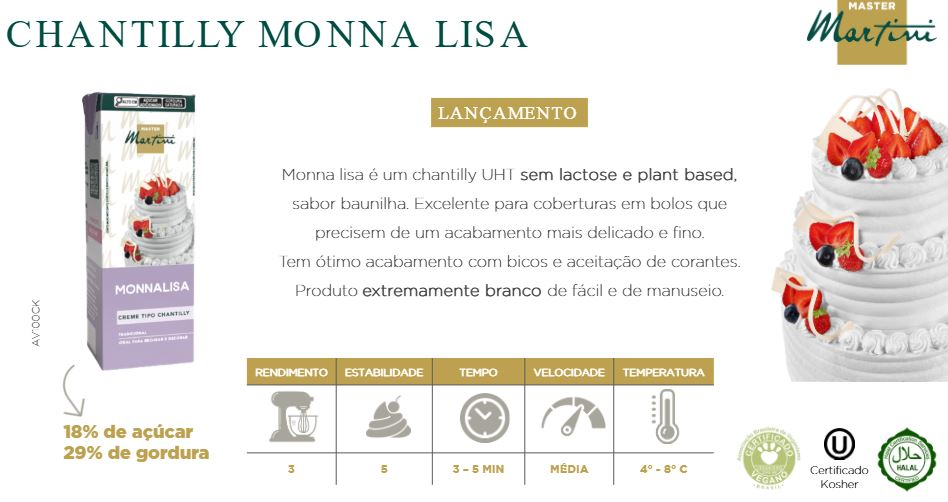 * DESCRIÇÃO: O Chantilly VEGANO Monna Lisa da Master Martini é perfeito para você que busca estabilidade, sabor suave e acabamento impecável. Eentre seus diferenciais estão: Plant-Based e zero lactose; Textura firme que resiste ao calor e ao frio; Rendimento incrível e ótimo custo-benefício. Ele é ideal para cobrir, alisar e decorar com perfeição, seja em bolos de vitrine ou para festas ao ar livre. Um chantilly com qualidade italiana!