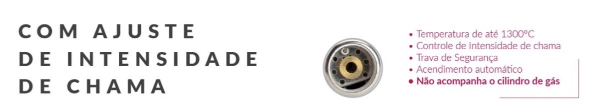 *DESCRIÇÃO: ndicação: Indicado para uso profissional em cozinhas, para flambar, dourar e gratinar receitas acrescentando mais vida, beleza e sabor. Utilizado na finalização de pratos, dentre outros usos. Diferenciais e Características: Possui fogo forte, com temperatura de até 1300°C. Com chama ajustável para maior versatilidade, permite diferentes níveis de intensidade, o que proporciona a utilização nos mais variados pratos. A necessidade da chama pode ser ajustada de acordo com a necessidade de aplicação. Sua utilização é simples e fácil, seguindo as orientações sobre modo de uso e da troca do gás. Para evitar o acendimento acidental, o maçarico possui o dispositivo de trava de segurança, que impede o aparelho de ligar. Possui ignição automática, que funciona diretamente no cartucho de gás. Fácil, prático e seguro durante a utilização e na troca do cartucho. Não inclui cilindro de gás. Modo de Usar: 1. Certifique-se de que o maçarico está devidamente encaixado e na posição desligado. 2. Com aponta do maçarico virado para longe do seu corpo, abra somente um pouco com controle de gás (girando no sentido anti-horário). Nota-se o som da saída do gás. 3. Aperte o botão de ignição para acender a chama. 4. Ajuste a chama, girando o botão do controle de gás. 5. Use o maçarico em local arejado, longe de produtos inflamáveis. 6. Caso o maçarico não acenda, retire a operação de montagem do maçarico na lata de gás butano. 7. Após o uso, certifique-se de desligar o maçarico para evitar acidentes 8. Depois do uso, espere o maçarico esfriar naturalmente e desconecte o maçarico da lata de gás butano. Nunca armazene o maçarico conectado a lata de gás. Siga as instruções e cuidados de armazenamento indicados na lata de gás. 9. Nunca conecte ou desconecte o maçarico com a válvula aberta e/ou maçarico aceso. Isto pode causar escape do gás e causar sérios danos. Observações: A chama poderá continuar por um curto período após o desligamento se ele for utilizado muito inclinado. Em baixas temperaturas, a chama será menor. Há a possiblidade da chama se apagar. A temperatura do bico do maçarico será elevada ao usar, ou após o seu uso, favor não tocar para evitar queimaduras. Manutenção: Limpe o maçarico utilizando um pano limpo e seco. Cuidados: Não utilize perto de produtos inflamáveis. Não faça a instalação do cilindro de gás perto do fogo, isto poderá gerar explosão. Usar a chama com fluxo baixo de gás poderá causar superaquecimento e danos ao maçarico. Nunca armazene com o maçarico conectado ao tubo de gás. Ao instalar cilindro de gás no aparelho faça a instalação seguindo as instruções exigidas pelo fornecedor. Se ao instalar o cilindro de gás observar um som como um assovio ou sentir cheiro de vazamento de gás, remova o cilindro seguindo as orientações de uso e reinicie o processo de instalação. Se mesmo assim permanecer o ruído e/ou o cheiro do vazamento de gás, pare de usar imediatamente. Não guarde de cabeça para baixo. Não incline ou balance forte ao acender. Instruções para Armazenamento: Manter em local seguro, seco e arejado, fora do alcance de crianças.