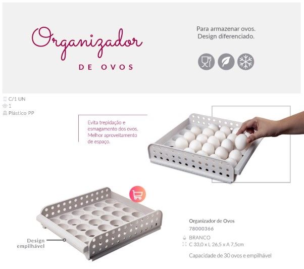 *EMBALAGEM: caixa com 1 organizador de ovos empilhável com capacidade para 30 ovos