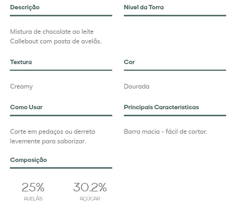 INGREDIENTES: Açúcar, avelãs, manteiga de cacau, leite em pó gordo, pasta de cacau, emulsionante, lecitina de soja, não contém glúten. Chocolate Belga Gianduia da Callebaut é um delicioso chocolate com 25% de avelãs que irá levar seus preparos para outro nível, esse toque perfeito fará toda a diferença em suas receitas. Ideal para a produção de doces finos e gourmets como ovos de páscoa, bombons, trufas, bolos, ganaches, sobremesas, coberturas, blindagens e muito mais.