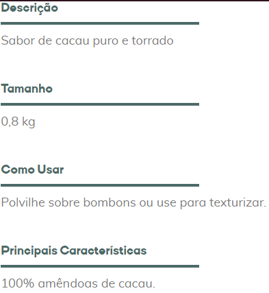 * DESCRIÇÃO: Nibs de cacau da Callebaut é a essência da amêndoa do cacau, passada por um processo meticuloso de produção até obter o resultado das tão amadas nibs de cacau, um ingrediente puro e com sabor tão intenso de deliciosos, acrescentando ainda sua textura crocante à suas receitas, levando suas produções à outro patamar. Os nibs podem ser acrescentados em receitas doces ou salgadas e até mesmo levá-los ao forno na produção de cookies, bolos ou massas em geral. Informações adicionais: Não é indicado a utilização dos nibs em receitas cremosas ou ganaches, pois ele tem um poder de absorção grande, perdendo então sua textura crocante.