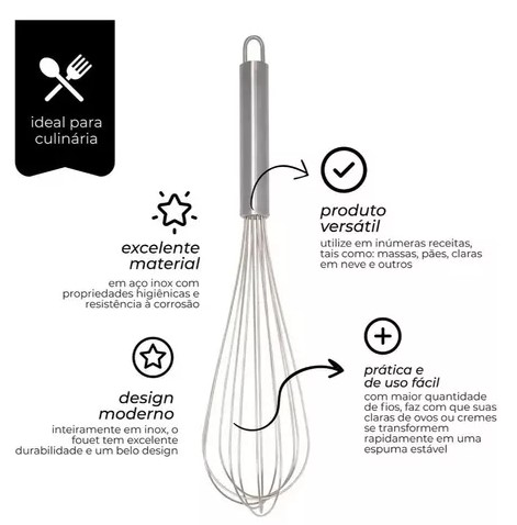 Além disso , o Batedor fouet conta com material de altissima qualidade e refino , assegurando assim que os ingredientes batidos fiquem cada vez mais homogêneos e misturados , para manter sempre suas receitas impecáveis .